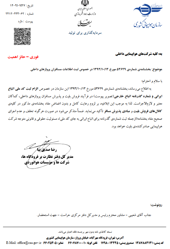الزام ثبت کد ملی اتباع ایرانی و شماره گذرنامه اتباع خارجی